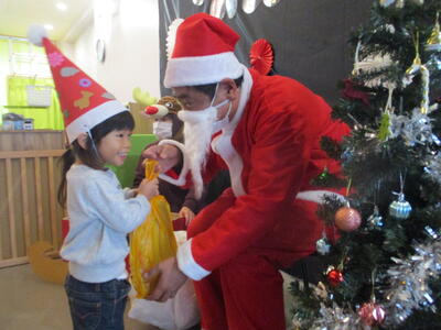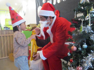 鬼の姿になった園長先生にも、「おには 、そと」「ふくは、うち」と豆を投げ