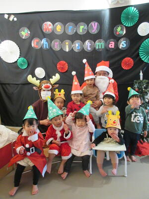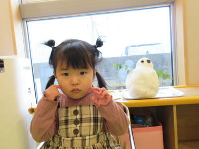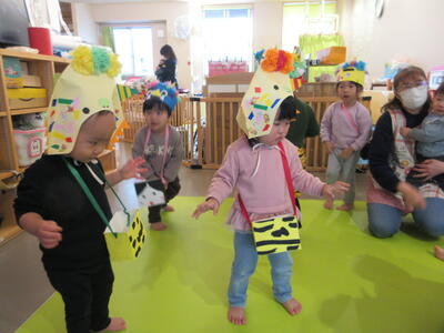 今日は、節分の日ということで、各クラスで作った鬼のお面と豆入れを持って、集合しました。